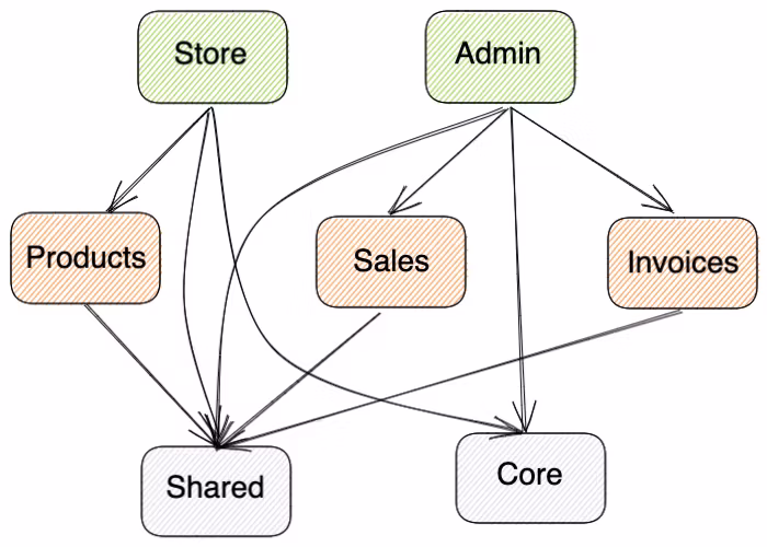 Our repository consists of two applications — Store and Admin. Each of them is composed of several feature libraries — Products (for Store), Sales, and Invoices (for Admin). Also, both of these applications depend on the Core library, and every project in our repo depends on our Shared library. Using common sense, we would like to enforce certain boundaries: